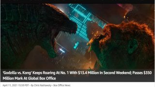 ตั้งแต่กลางดึกของเมื่อคืนนี้(เข้าวันใหม่บ้านเราแต่ที่อเมริกายังคงเป็นวันที่ 11) สื่อมวลชนพร้อมใจกันลงข่าวก็อดซิลล่าปะทะคองทำสถิติรายได้สูงสุดในอเมริกาในยุคโควิดแพนดามิกเหนือเทเน็ต จบสัปดาห์ที่สองรายได้รวมเกือบ 70 ล้าน US$ ที่จีนได้รวมถึง 165 ล้าน US$ รวมทั่วโลกขณะนี้ 357 ล้าน US$ Godzilla Vs Kong ครองตำแหน่งภาพยนตร์ฮอลลีวูดที่ทำเงินสูงสุดของโลกประจำปีนี้และขึ้นไปเป็นอันดับ 3 ของโลกไปแล้วตั้งแต่สั.. ดูเพิ่ม