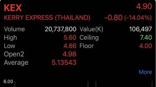 เมื่อวันที่ 8 พฤศจิกายน พ.ศ. 2566 บริษัท เคอรี่ เอ็กซ์เพรส (ประเทศไทย) จำกัด (มหาชน) หรือ KEX รายงานผลประกอบการประจำไตรมาส 3 ปี 66 ขาดทุนสุทธิ 889.9 ล้านบาท ขาดทุนเพิ่ม 31.9% จากช่วงเดียวกันของปีก่อน และมีรายได้ 2,923.3 ล้านบาท ลดลง 31.7% จากช่วงเดียวกันของปีก่อน สาเหตุหลักของผลขาดทุนที่เพิ่มขึ้นมาจากรายได้จากการขนส่งพัสดุที่ลดลง 31.7% จากช่วงเดียวกันของปีก่อน เป็นผลมาจากการแข่งขันที่รุนแรงจากผู้.. ดูเพิ่ม