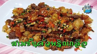 หมูสามชั้นคั่วซีอิ้ว เครื่องปรุงและส่วนผสม 1.เนื้อหมูสามชั้น 500 กรัม 2.ซีอิ้วขาว 1 ช้อนโต๊ะ 3.ซอสปรุงรส 1 /2 ช้อนโต๊ะ 4.น้ำตาลทรายเล็กน้อย 5.พริกไทยป่น 1/4 ช้อนชา 6.ซีอิ้วดำเล็กน้อย 7.เกลือป่น 1 ช้อนชา วิธีทำ 1.ล้างหมูสามชั้นให้สะอาดซับน้ำให้แห้ง ตั้งน้ำให้ร้อนใส่เกลือป่นลงไปพอน้ำเดือดใส่เนื้อหมูลงไปต้มให้สุก ตักขึ้นพักไว้ให้เย็นหั่นเป็นชิ้น พักเตรียมไว้ 2.นำหมูสามชั้นที่หั่นเตรียมไว้ลงไปคั่ว.. ดูเพิ่ม