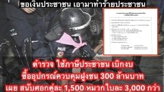 เปิดงบ ประชาชนจ่าย 300 ล้านบาท ที่ตำรวจขอไปเพื่อใช้เป็นอุปกรณ์บดขยี้ม็อบเยาวชน ของบกันผ่าน โครงการจัดหาเครื่องมืออุปกรณ์ควบคุมฝูงชนในการชุมนุมสาธารณะ ในกรมสรรพาวุธ สํานักงานตํารวจแห่งชาติ จำนวนเงินทั้งหมด 300 ล้านบาท เท่านั้นไม่พอ เมื่อดูเอกสารดีๆจะพบความผิดปกติ เช่น งบที่ขอไปไม่ใช่เอาไปแค่ซื้อสินค้า แต่เป็น "งบลงทุน"???? เอาเงินประชาชนไปลงทุนอะไร?? ด้านมาก ขอเงินประชาชนไปซื้ออาวุธมาฝาดคนยังไม่พอ.. ดูเพิ่ม