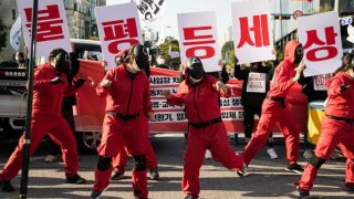 สีสัน "ม็อบเกาหลี" แต่งคอสตูมซีรีส์ดัง "Squid Game" รวมตัว "ประท้วงรัฐบาล" เรียกร้องสิทธิแรงงานที่ไม่เป็นธรรม