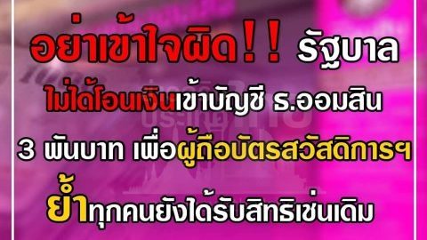 อย่าเข้าใจผิด ❗️ รัฐบาลไม่ได้โอนเงินเข้าบัญชี ธ.ออมสิน 3 พันบาท เพื่อผู้ถือบัตรสวัสดิการฯ ย้ำทุกคนยังได้รับสิทธิเช่นเดิม