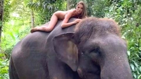 นางแบบดังถูกถล่มยับ หลังสลัดผ้าถ่ายรูปกับช้างใกล้สูญพันธุ์