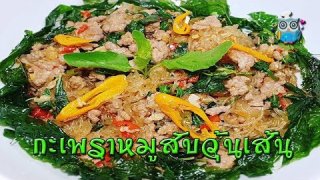 กะเพราหมูสับวุ้นเส้น เครื่องปรุงและวัตถุดิบ 1.หมูสับ 250 กรัม 2.วุ้นเส้น 70 กรัม 3.พริก/ กระเทียมไทย 4.พริกไทย 4 เม็ด 5.พริกเหลืองหั่นเฉียง 6.น้ำตาลทราย 1 1/2ช้อนโต๊ะ 7.ซอสปรุงรส 3 ช้อนโต๊ะ 8.น้ำมันหอย 1 1/2 ช้อนโต๊ะ 9.น้ำมันพืช 3 ช้อนโต๊ะ 10.ใบกะเพรา วิธีทำ 1.นำวุ้นเส้นไปแช่น้ำให้นิ่มตัดเป็นท่อนยาวประมาณสัก 1 คืบ พักเตรียมไว้ 2.โขลกพริก กระเทียม พริกไทยให้เข้ากันพอหยาบๆ พักเตรียมไว้ ตั้งกระทะใส่.. ดูเพิ่ม