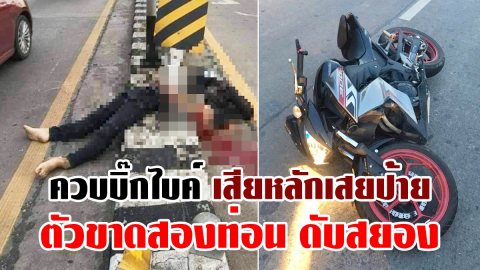 สยองอีก หนุ่มควบบิ๊กไบค์คู่ใจชนป้ายจราจร ตัวขาดสองท่อน