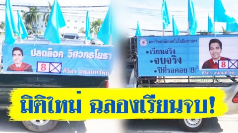 วันที่ 25 พ.ย.61 ผู้ใช้เฟซบุ๊ก Sittikorn Deeporm ได้โพสต์ภาพรถแห่ติดป้าย คล้ายกับรถหาเสียงเลือกตั้ง โดยมีภาพของชายหนุ่มในชุดครุย มีข้อความระบุว่า ปลดล็อค วิศวกรโยธา นอกจากนี้ยังมีช่องหมาย 8 และชื่อ ศิริกร ถนอมทรัพย์ ส่วนอีกคันมีป้ายติดรูปเจ้าตัวและข้อความว่า เรียนจริง จบจริง 8 ปีที่รอคอย ทำเอาผู้คนที่เห็นต่างฮือฮากันเป็นแถว คนจริงต้องแบบนี้ เรียนจริง จบจริง ให้มันรู้กันไปเลย คนจริง 2018 โดยผู้โพส.. ดูเพิ่ม