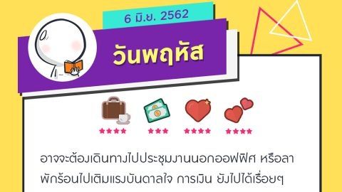 เช็คดวงรายวันที่ 6 มิ.ย. 62ใครกันหนอที่วันนี้งานไม่เยอะ แต่เงินเยอะมากกกก แต่จะมีใครบางคนที่จะต้องเสียเงินไปกับค่ายา เพราะปวดทั้งกายทั้งใจ ไปดูกันเลยน้าาา ดูเพิ่ม