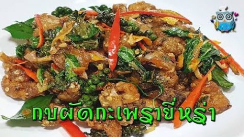กบผัดกะเพรายี่หร่า เครื่องปรุงและวัตถุดิบ 1.กบ 2 ตัวน้ำหนัก 650 กรัม 2.กระเทียมไทย 6 กลีบ 3.พริกขี้หนูเหลืองตามชอบ 4.พริกไทยเม็ดตามชอบ 5.แป้งข้าวโพด 1/4 ถ้วยตวง 6.ซอสปรุงรส 1 ช้อนชา 7.น้ำตาลทราย 1/2 ช้อนโต๊ะ 8.น้ำปลาเกือบ 1 ช้อนโต๊ะ 9.น้ำมันหอย 1 ช้อนโต๊ะ 10.น้ำมันพืช 11.ใบกะเพรา 12.ใบยี่หร่า 13.พริกแดงหั่นแฉลบ 14.พริกไทยอ่อน 15.กระชายซอย วิธีทำ 1.นำกบที่ลอกหนักควักไส้ออกแล้วมาสับเป็นชิ้นพอดีคำ ล้.. ดูเพิ่ม