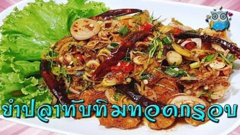 ยำปลาทับทิมทอดกรอบ เครื่องปรุงปละวัตถุดิบ 1.เนื้อปลาทับทิม 150 กรัม 2.พริกเผาปลา 2 ช้อนโต๊ะ 3.น้ำตาลทราย 1/2 ช้อนโต๊ะ 4.น้ำปลา 1 ช้อนโต๊ะ 5.น้ำมะนาว 1 1/2 ช้อนโต๊ะ 6.พริกแดงซอย 7.หอมแดงซอย 8.ต้นหอมซอย 9.ตะไคร้ซอย 10.มะกรูดซอย 11.น้ำมันพืช 12.แป้งทอดกรอบ 1 ช้อนโต๊ะ 13.พริกทอด วิธีทำ 1.หั่นเนื้อปลาทับทิมเป็นสี่เหลี่ยมเต๋าคลุกกับแป้งทอดกรอบบางๆ 2.ตั้งน้ำมันให้ร้อน นำเนื้อปลาลงทอดให้เหลืองกรอบ พักไว้ใ.. ดูเพิ่ม