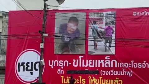 เจ้าของตึกร้างในจังหวัดสงขลา ได้ถูกโจรแอบไปขโมยเหล็กและทรัพย์สินมีค่าที่อยู่ในตึกจนเกลี้ยงและได้รับความเสียหายอย่างหนัก โดยได้แจ้งตำรวจจับกุม กลุ่มโจรดังกล่าวแล้วตั้ง4ครั้งและตำรวจก็จับได้ทั้ง4ครั้ง แต่พอพ้นโทษออกมาก็กลับมาขโมยอีก จนเจ้าของตึกท้อไร้ทางออก จึงได้ขึ้นป้ายอ้อนวอนโจรขอร้องให้หยุดขโมย ดูเพิ่ม