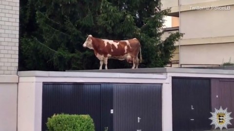 พบวัวตัวใหญ่โผล่บนหลังคาโรงรถชาวบ้าน สุดงง มันขึ้นไปได้ยังไง?