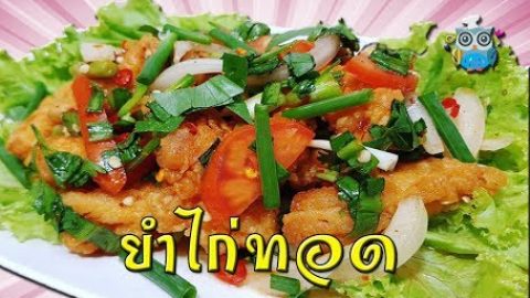 ยำไก่ทอด เครื่องปรุงและวัตถุดิบ 1.เนื้ออกไก่ 120 กรัม 2.แป้งทอดกรอบ 3 ช้อนโต๊ะ 3.น้ำเปล่าเย็นจัด 1/4 ถ้วยตวง 4.น้ำปลา 2 ช้อนโต๊ะ 5.น้ำตาลทราย 1 1/2 ช้อนโต๊ะ 6.น้ำมะนาว 2 1/2 ช้อนโต๊ะ 7.พริกแดงซอย 8.พริกป่น 1 ช้อนชา 9.ต้นหอมหั่นท่อน 10.ผักชีฝรั่งซอย 11.หอมหัวใหญ่ซอย 12.ผักชีหั่นท่อน 13.มะเขือเทศ 14.น้ำมันพืช วิธีทำ 1.หั่นเนื้ออกไก่เป็นชั้นพอดีคำ พักเตรียมไว้ 2.ผสมแป้งทอดกรอบกับน้ำเปล่าเย็นจัด 3.ตั้.. ดูเพิ่ม