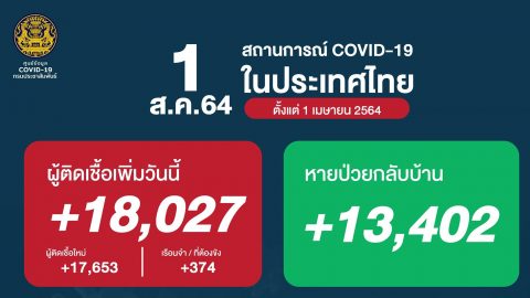 สถานการณ์ "โควิด-19" ในประเทศไทยขณะนี้เรียกได้ว่ากำลังอยู่ในภาวะวิกฤติรุนแรง มีผู้ป่วยอีกจำนวนมากที่ไม่สามารถเข้าถึงระบบการรักษาได้ เนื่องจากผู้ติดเชื้อเพิ่มขึ้นอย่างรวดเร็ว ส่วนใหญ่ต้องนอนรอความช่วยเหลืออยู่ที่บ้าน ถึงแม้ว่าจะเพิ่มโรงพยาบาลสนามและเตียงแล้วก็ตาม ศบค.รายงานสถานการณ์โควิด วันที่ 1 ส.ค.64 ดังนี้ ผู้ป่วยติดเชื้อใหม่ 18,027 ราย เสียชีวิตเพิ่ม 133 คน หายป่วยเพิ่ม 13,402 ราย ยอดผู้ป่วยย.. ดูเพิ่ม