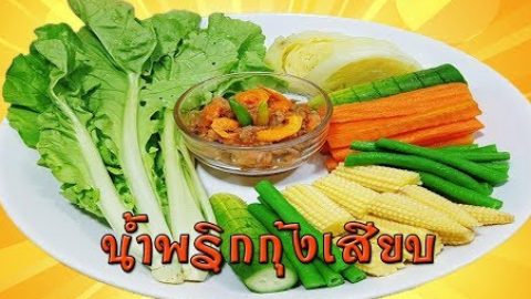 น้ำพริกกุ้งเสียบ เครื่องปรุงและวัตถุดิบ 1.กุ้งเสียบย่างหรือคั่ว 30 กรัม 2.พริกขี้หนู กระเทียม หอมแดง 3.กะปิ 1 ช้อน 4.น้ำมะนาว 1 ลูกใหญ่ 5.น้ำตาลปี๊บ 3 ช้อนชา 6.ถั่วฝักยาว แตงกวา แครอท กะหล่ำปลี ข้าวโพดอ่อน ผักกาด 7.เกลือป่น วิธีทำ 1.คั่วพริก กระเทียม หอมแดงให้หอม เตรียมไว้ 2.นำกะปิห่อใบตองไปย่างให้หอมเตรียมไว้ 3.นำพริกกระเทียมหอมแดง กะปิลงตำให้เข้ากัน 4.ใส่น้ำตาลปี๊บ กุ้งเสียบ น้ำมะนาว คลุกให้เข้า.. ดูเพิ่ม
