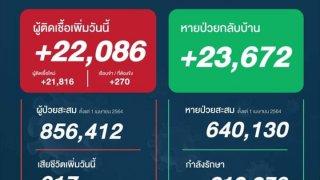 โควิดวันนี้ หายป่วยกลับบ้านเกิน 23,000 ราย ส่วนผู้ติดเชื้อใหม่ยังสูงเกิน 22,000 ราย เสียชีวิตเกิน 200 ราย ศบค. รายงานสถานการณ์โควิด 19 วันนี้ ยอดผู้ติดเชื้อเพิ่ม ยังสูง 22,086 ราย เป็นผู้ติดเชื้อรายใหม่ 21,816 ราย ติดจากเรือนจำ/ที่ต้องขัง 270 ราย หายป่วยกลับบ้าน วันนี้ 23,672 ราย หายป่วยสะสม 640,130 ราย กำลังรักษา 210,376 ราย ผู้ป่วยสะสมรวม 856,412 ราย เสียชีวิตวันนี้ 217 ราย ดูเพิ่ม