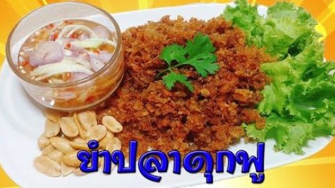 ยำปลาดุกฟู เครื่องปรุงและวัตถุดิบ 1.ปลาดุกอุยย่าง 1 ตัว 2.มะม่วงเปรี้ยวซอย 3.ถั่วทอด 4.พริกขี้หนูสับหยาบ 1 ช้อนโต๊ะ 5.น้ำตาลทราย 1 ช้อนโต๊ะ 6.น้ำปลา 3 ช้อนโต๊ะ 7.น้ำมะนาว 1 ช้อนโต๊ะ 8.หอมแดงซอย 9.เกร็ดขนมปัง 1/2 ถ้วยตวง 10.น้ำมันพืช 11.ผัดสลัด ผักชีสำหรับตกแต่ง วิธีทำ 1.แกะเนื้อปลาดุกไม่เอาหนัง นำไปตำรวมกับเกร็ดขนมปังใส่น้ำมันพืช 1 ช้อนโต๊ะ เพิ่มให้เขือปลาดุกฟูน่ารับประทาน 2.ตั้งน้ำมันเยอะๆให้ร้อน.. ดูเพิ่ม