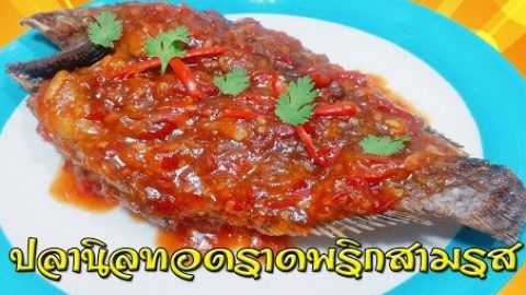 ปลานิลทอดราดพริกสามรส เครื่องปรุงและวัตถุดิบ 1.ปลานิล 1 ตัว 2.น้ำมันสำหรับทอด 3.พริกขี้ฟ้าแดง 8 เม็ด 4.กระเทียม 4 กลีบ 5.รากผักชี 2 ต้นเล็ก 6.น้ำมะขามเปียก 1 1/2 ช้อนโต๊ะ 7.น้ำปลา 2 ช้อนโต๊ะ 8.น้ำตาลปี๊บ 1 1/2 ช้อนโต๊ะ 9.น้ำเปล่า 10.ผักชี พริกหั่นเส้นสำหรับตกแต่ง วิธีทำ 1.ผ่าท้องปลาควักไส้ออก ตัดครีบขูดเกร็ดล้างให้สะอาดพักไว้ให้สะเด็ดน้ำ 2.ตำพริกชี้ฟ้า กระเทียม รากผักชีโขลกให้เข้ากัน 3.นำปลาลงทอดใ.. ดูเพิ่ม