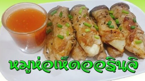 หมูห่อเห็ดออรินจิ เครื่องปรุงและวัตถุดิบ 1.เห็ดออรินจิ 4 ดอก 2.หมูสไลด์ 8 ชิ้น 3.น้ำจิ้มสุกี้ 4.ไม้จิ้มฟัน 5.เนย 6.น้ำมันพืช 1/4 ถ้วยตวง 7.ต้นหอมซอย 8.พริกไทยป่น 9.งาดำ วิธีทำ 1.ผ่าครึ่งเห็ดออรินจิพักไว้ 2.นำหมูสไลด์มาพันกับเห็ดที่ผ่าครึ่ง กลัดด้วยไม้จิ้มฟัน 3.ตั้งกระทะใส่น้ำมันและเนย นำเห็ดที่พันด้วยหมูสไลด์ลงทอด 4.ตักใส่จานโรยด้วยพริกไทยป่นและต้นหอมซอยและงาดำ 5.ทานคู่กับน้ำจิ้มสุกี้ ดูเพิ่ม