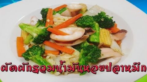 ผัดผักรวมน้ำมันหอยปลาหมึก เครื่องปรุงและวัตถุดิบ 1.ปลาหมึก 1 ตัว 2.บล็อคโคลี่ 3.ผักกาดขาว 4.ข้าวโพดอ่อน 5.แครอท 6.น้ำเปล่าเล็กน้อย 7.ซอสปรุงรส 1 ช้อนโต๊ะ 8.น้ำมันหอย 1 ช้อนโต๊ะ 9.น้ำตาล 3 ช้อนชา 10.กระเทียมสับ 3 กลีบ 11.พริกไทยป่น 12.น้ำมันพืช วิธีทำ 1.ล้างปลาหมึกให้สะอาดหมึกหั่นเป็นแว่นพักไว้ 2.หั่นผักขนาดชิ้นพอคำ 3.ตั้งน้ำมันพอร้อนใส่กระเทียมลงเจียวให้หอมใส่ปลาหมึกลงไป 4.ใส่บล๊อคโคลี่ แครอท ข้า.. ดูเพิ่ม