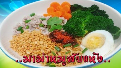 มาม่าหมูสับแห้ง เครื่องปรุงและวัตถุดิบ 1.บะหมี่กึ่งสำเร็จรูป 1 ซอง 2.แครอทลวก 3.บล๊อคโคลี่ลวก 4.ต้มหอมซอยผักชี 5.หมูสับรวน 10 กรัม 6.ไข่ต้ม 7.พริกเผา 8.ถั่วบุบหยาบ วิธีทำ 1.ลวกเส้นบะหมี่กึ่งสำเร็จรูปเสร็จแล้วคลุกกับน้ำมันในซองเพื่อให้เส้นไม่ติดกัน 2.แต่งด้วยหมูสับ บล็อคโคลี่ แครอทลวก ถั่วบุบ ไข่ต้มผ่าซีก 3.พริกเผา และเครื่องปรุงในซองของบะหมี่ โรยหน้าด้วยผักชีและต้นหอม 4.เวลารับประทานคลุกให้เข้ากัน ดูเพิ่ม