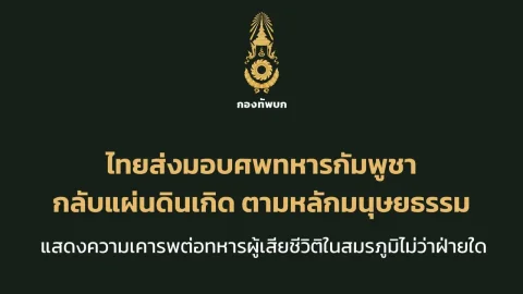 ไทยส่งมอบศพทหารกัมพูชาจำนวน 12 นาย กลับแผ่นดินเกิดตามหลักมนุษยธรรม แสดงความเคารพต่อผู้เสียชีวิตในสมรภูมิไม่ว่าฝ่ายใด เมื่อวันที่ 27 กรกฎาคม 2568 เวลา 16.30 น. เจ้าหน้าที่ฝ่ายไทยได้ดำเนินการส่งมอบศพทหารกัมพูชาจำนวน 12 นาย ซึ่งเสียชีวิตจากการสู้รบในพื้นที่ภูมะเขือ ให้แก่เจ้าหน้าที่ฝ่ายกัมพูชา ณ จุดผ่านแดนถาวรช่องสะงำ ตำบลไพรพัฒนา อำเภอภูสิงห์ จังหวัดศรีสะเกษ เพื่อนำศพกลับไปประกอบพิธีทางศาสนาในภูมิล.. ดูเพิ่ม